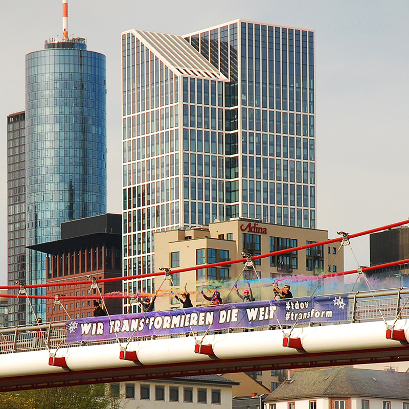 Aktion zum Trans Day of Visibility 2017 auf einer Brücke in Frankfurt über dem Main